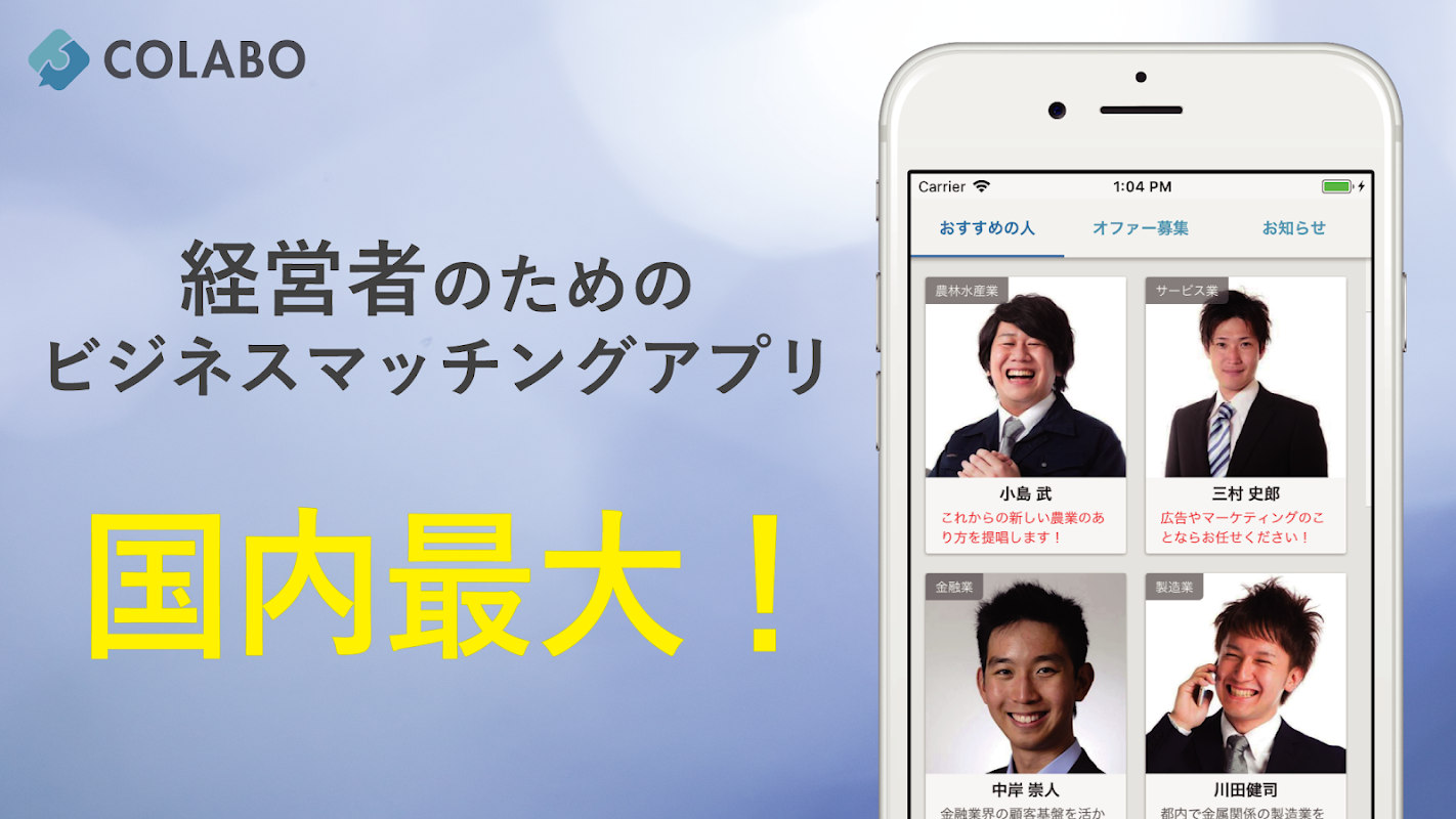 COLABOは、事業を拡大させたい経営者のためのビジネスマッチングアプリです。