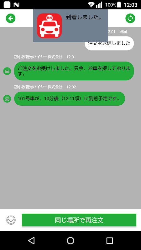 6、注文確定後はプッシュ通知にて、”到着予定時間・お車到着”のご連絡