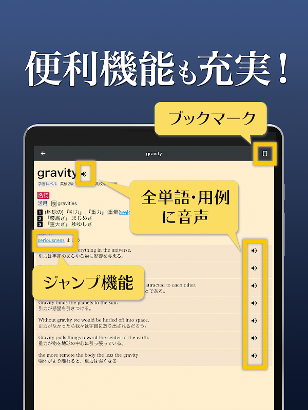 ความสามารถในการค้นหาที่น่าประทับใจ คำอธิบายและตัวอย่างมากมาย สุดยอดแอพพจนานุกรมภาษาอังกฤษ - ญี่ปุ่นที่รองรับการเล่นการออกเสียงของประโยคตัวอย่าง!