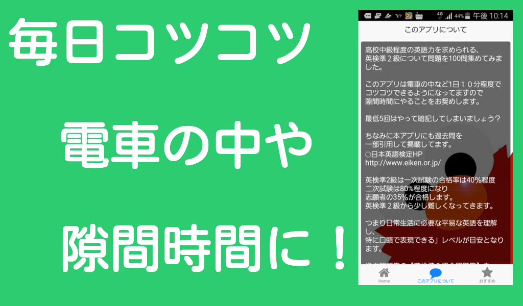 このアプリは英検準2級の合格をめざすための無料学習アプリです。練習問題は60問電車の中など1日10分程度でコツコツできます。