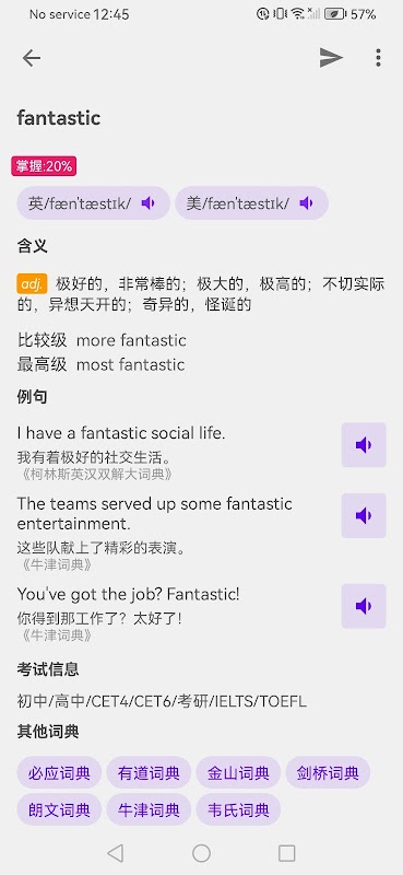 English Wang รองรับการแสดงข้อมูลต่างๆ เช่น สัญลักษณ์สัทศาสตร์ ประโยคตัวอย่าง รูปแบบต่างๆ และระดับการทดสอบคำศัพท์ และยังสนับสนุนให้ผู้ใช้เพิ่มบันทึกย่อ แท็ก และข้อมูลอื่นๆ ในแบบของคุณ ใช้ English Wang เพื่อบอกลาการปิดเสียงภาษาอังกฤษ