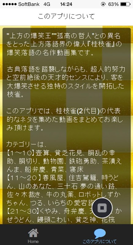 このアプリでは、桂枝雀(2代目)の代表的なネタを集めた動画をまとめてお楽しみ頂けます。