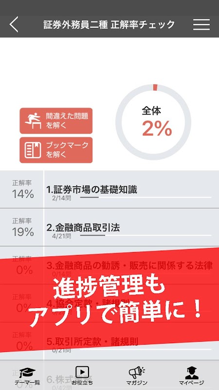คุณสามารถตรวจสอบอัตราความคืบหน้าและอัตราคำตอบที่ถูกต้องได้ที่หน้าของฉัน คุณสามารถดูอัตราความคืบหน้าและอัตราคำตอบที่ถูกต้องสำหรับแต่ละธีมได้ ดังนั้นคุณจึงสามารถดูความสามารถและจุดอ่อนของคุณในปัจจุบันได้อย่างรวดเร็ว นอกจากนี้คุณยังสามารถแยกเฉพาะคำถามที่คุณทำผิดหรือวิดีโอและคำถามที่คุณบุ๊กมาร์กไว้แล้วลองอีกครั้ง