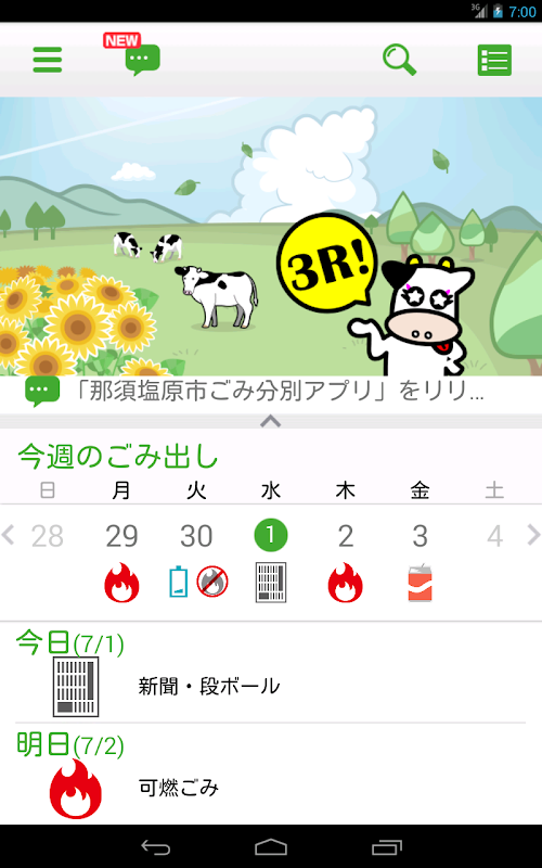 ดังกล่าวเป็นวิธีการบางส่วนของคอลเลกชันวันและฝุ่นละอองจากถังขยะใน Nasushiobara มันได้เปิดตัวโปรแกรมที่สามารถยืนยันได้อย่างง่ายดายโดยใช้ความหลากหลายของข้อมูลมาร์ทโฟนที่คุ้นเคยในถังขยะ