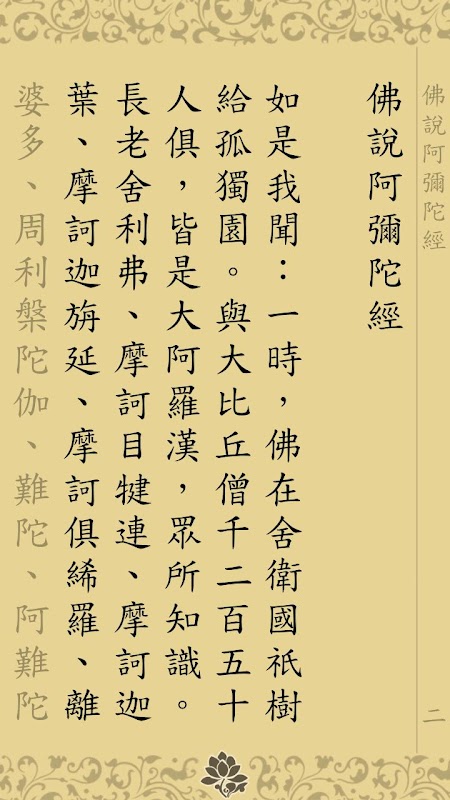 阿彌陀經--又稱一切諸佛所護念經、諸佛所護念經、小無量壽經、小經、四紙經。收於大正藏第十二冊。淨土三部經之一。漢譯本於姚秦弘始四年(西元402)由鳩摩羅什譯出,譯文簡潔流麗,故誦讀者最多。內容敘述阿彌陀佛西方淨土之清淨莊嚴,諸佛真誠讚歎眾生之往生淨土、六方諸佛之印證,及持名念佛等,使淨土信仰明確而平易。