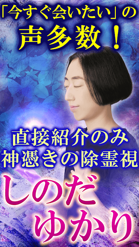 「やっと本物に出会えた」口コミで広がり、人気が殺到。紹介制のため、なかなか出会えない除霊師「しのだゆかり」。結ばれない片想い、頑張り続けている婚活、うまく行かない仕事……除霊を行い、あなたの想いを成就させていきます。