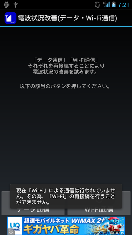 ※当アプリはデータ通信及びWi-Fiを一度OFFにし再度ONに戻すことにより電波状況の改善を行っています。その為、元々電波状況が悪い場所では効果はありません。