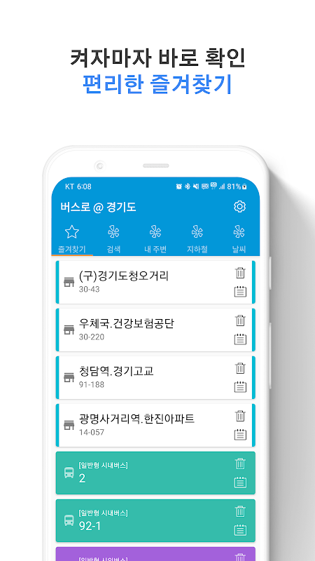 แอพสำหรับชาวคยองกีโดทุกคนที่เดินทางด้วยรถบัส โดยรถบัสคยองกีโด! นอกจากข้อมูลการมาถึงของรถบัสแล้ว ยังให้ข้อมูลสภาพอากาศและข้อมูลการมาถึงของรถไฟใต้ดินอีกด้วย