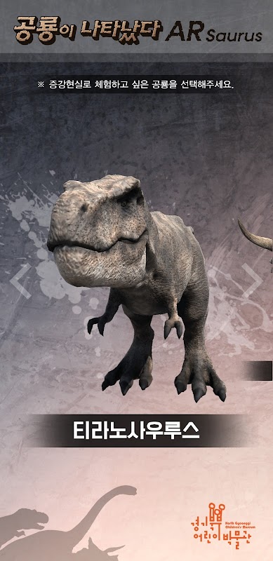 เป็นบริการเสริมประสบการณ์บนมือถือที่ให้คุณได้เห็นไดโนเสาร์เสมือนจริง (AR) ที่พิพิธภัณฑ์เด็ก North Gyeonggi และแก้ปัญหาด้วยแบบทดสอบ