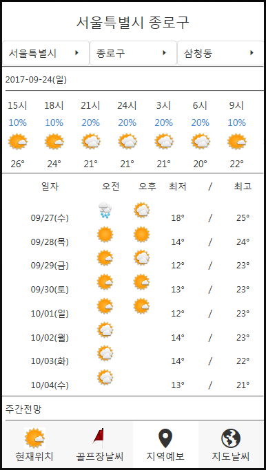 즐겨찾는 골프장의 일기예보 및 기상정보를 쉽게 알아볼수 있는 앱일반 지역날씨 및 GPS를 이용한 현재 위치 날씨정보를 쉽게 보여주더록 구성