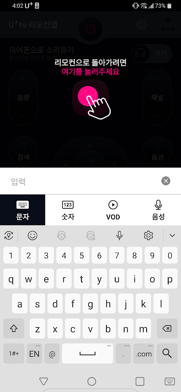 UHD2, UHD3, UHD4와 사운드바 블랙 고객님께서는 신규 리모컨앱을 설치하여주세요. (U+tv홈 > TV앱스 > U+추천앱에서 U+tv 리모컨앱 pair를 선택하신 후 화면 하단의 'U+tv 리모컨앱 설치하기' 버튼을 누르시면 신규 앱을 설치하여 사용하실 수 있습니다.) 빠른 시일 내에 tvG와 UHD1에서도 신규 앱을 사용하실 수 있도록 조치하겠습니다. 감사합니다.