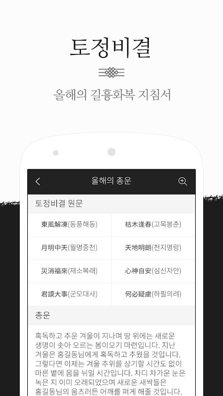 ★오늘 운세 - 매일매일 똑같은 하루 같지만 미묘한 차이의 좋고 나쁨을 심도있게 알려드립니다. 본인의 타고난 운과 오늘의 운에 연결고리를 만들어 보다 정확히 오늘의 운을 파악할 수 있도록 하였습니다.(오늘의 운세 총평/ 애정운/ 재물운/ 소망운)