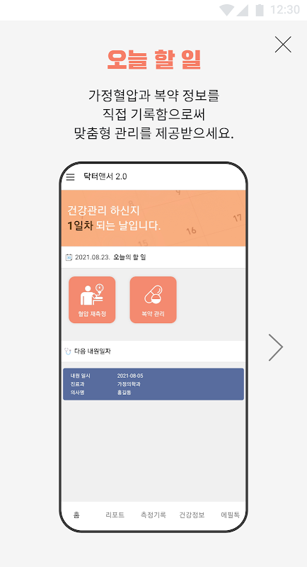또한, 고혈압 치료에 있어 가장 중요한 "가정혈압"을 직접 기록하고 맞춤형 관리를 제공받으세요!