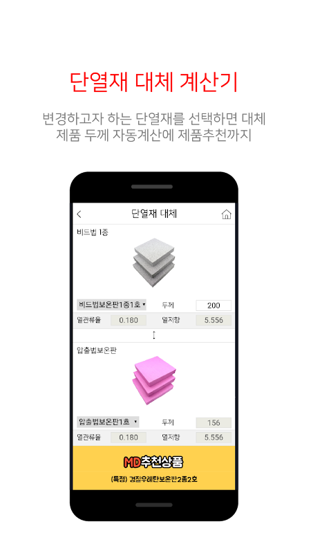 : 원본 단열재의 제품과 두께를 입력하면 비교하고자 하는 단열재의 두께, 열관류율, 열저항이 자동으로 계산. 또한 앱에서 최적의 상품을 추천하여 고객이 손쉽게 구매 가능(전화 및 카카오톡 문의)