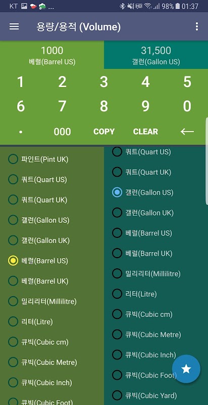 길이,거리,질량,무게,전원,압력,속도,온도,시간,토크,용량,용적,영역,요리,디지털파일,에너지,연료소비,환율등 모든 단위별 수치를 변환 계산 수행