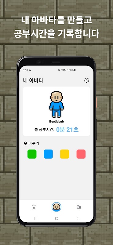 휴대폰의 유혹을 이기지 못하고 다른 앱을 실행하는 순간 내 아바타는 독서실에서 잠을 자기 시작하고 공부시간 기록도 멈춥니다.
