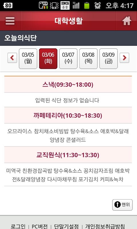 편의시설안내 / 무선랜사용안내 / 오늘의식단 / 버스도착알리미 / 페이스북