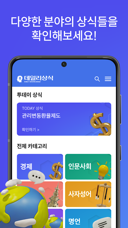 สร้างสามัญสำนึกในด้านต่างๆ เช่น เศรษฐกิจ ประวัติศาสตร์เกาหลี สุภาษิต สำนวนสิงโต เมืองหลวง และการสะกดคำ! ฉลาดขึ้นวันละก้าวผ่านสามัญสำนึกของวันนี้!