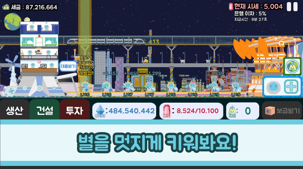여러가지 방법으로 돈을 모아서 별을 발전 시켜보세요.