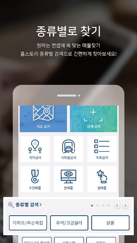 걸어서 5분 역세권, 오피스텔, 아파트, 원룸ㆍ투룸 등 내가 원하는 컨셉에 맞는 매물을 한눈에 찾아 볼 수 있습니다.