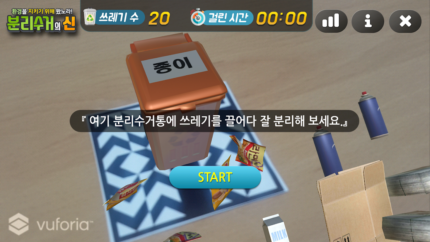 '분리수거의 신'은 다양한 종류의 쓰레기를 정확하게 분리 수거해 보는 AR 게임 콘텐츠입니다.