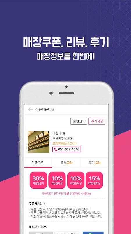 미용 네일 속눈썹 왁싱 에스테틱 기타심사 후 등록된 매장/할인쿠폰 정보제공최대할인 80% / 1년간 사용가능한 할인쿠폰지금 다운받으세요.