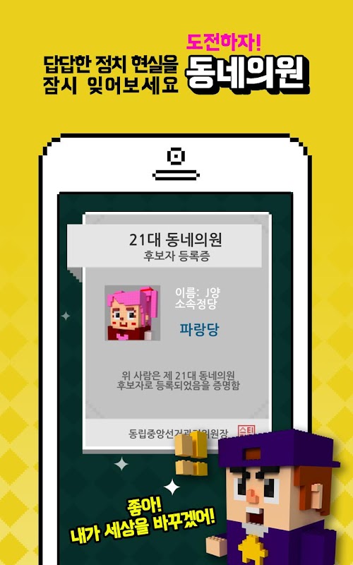 “뽑아주세요”는 내가 직접 후보자가 되어 유권자를 내 지지자로 설득하여 선거를 치르는 선거게임 입니다.