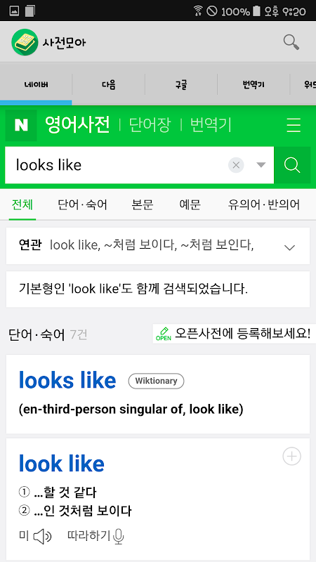 상단 검색바를 통해 한번에 동시에 웹사전 검색이 가능해요~