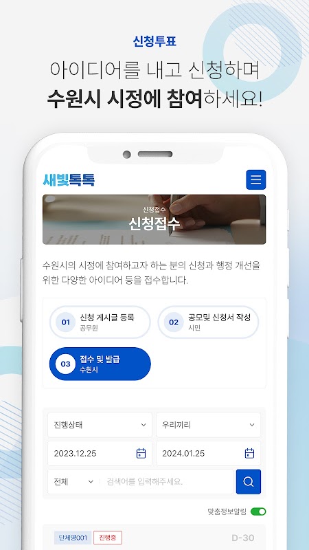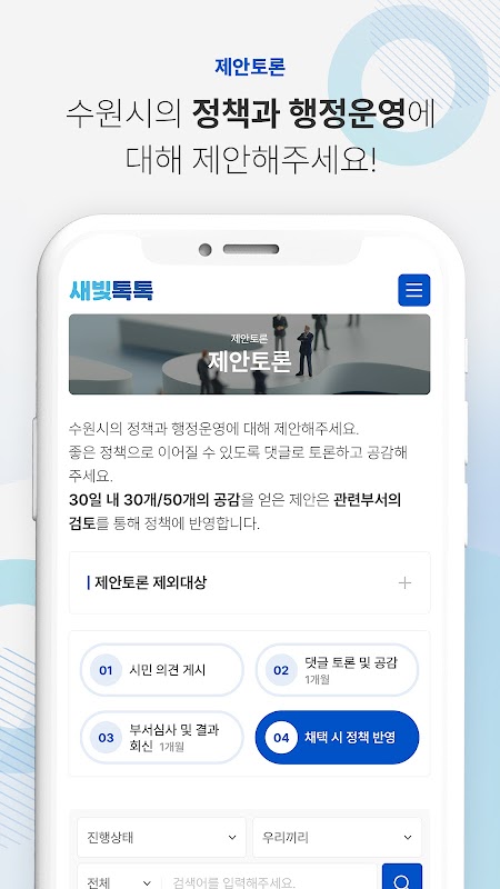 แพลตฟอร์มการมีส่วนร่วมของประชาชนบนมือถือ Saebit Tok Tok เป็นหน้าต่างสื่อสารสองทางที่พลเมืองเสนอนโยบายต่อเมือง Suwon สะท้อนความคิดเห็นของประชาชนในนโยบายและถามความคิดเห็นของประชาชนผ่านแบบสำรวจ การลงคะแนน และแอปพลิเคชัน เราให้บริการต่าง ๆ เช่น: