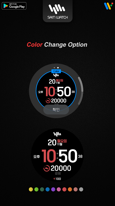 *แอพสมาร์ทโฟนเป็นแอพเพิ่มเติมในแอพ Watchface ที่อธิบายคู่มือการดาวน์โหลด อาจแตกต่างจากภาพหน้าจอหน้าปัดของแอปสมาร์ทโฟนและภาพหน้าจอหน้าปัดนาฬิกาที่ดาวน์โหลดจริง ผลิตภัณฑ์แอปหน้าปัดนาฬิกาส่วนใหญ่ของ SamWatch มีแอปสำหรับสมาร์ทโฟน