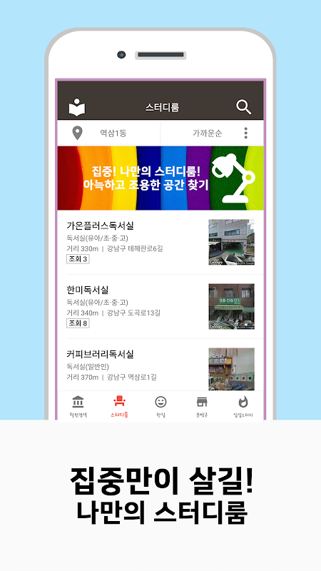 학원, 스터디룸 정보 간편하게 검색하세요.