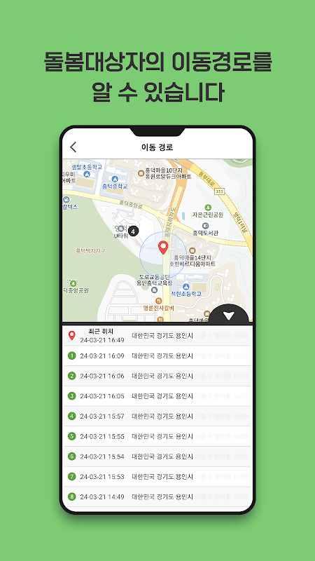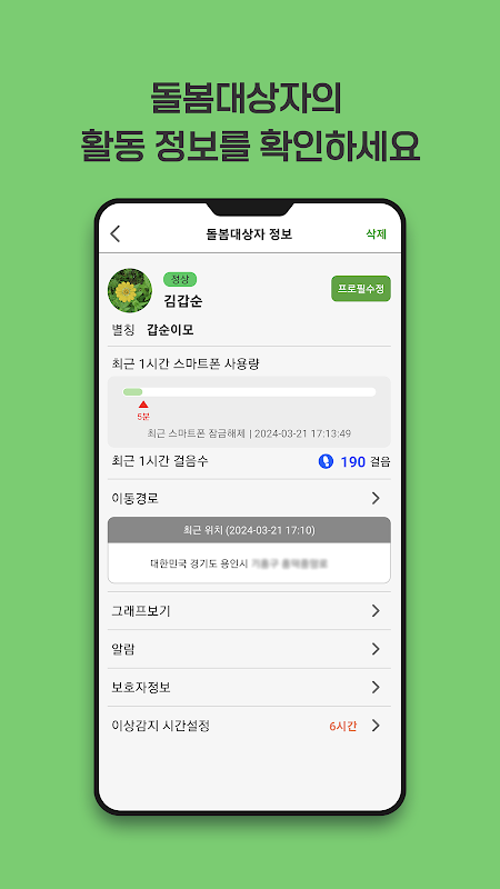 - เมื่อบุคคลที่ลงทะเบียนภายใต้การคุ้มครองติดตั้งแอปผู้พิทักษ์บนสมาร์ทโฟนและเข้าสู่ระบบด้วยหมายเลขโทรศัพท์ แอปผู้ปกครองจะสามารถระบุได้ว่าบุคคลนั้นกำลังใช้โทรศัพท์มือถือของตน จำนวนก้าว ฯลฯ และส่งการแจ้งเตือนหาก บุคคลนั้นไม่ได้ใช้งานในช่วงระยะเวลาหนึ่ง