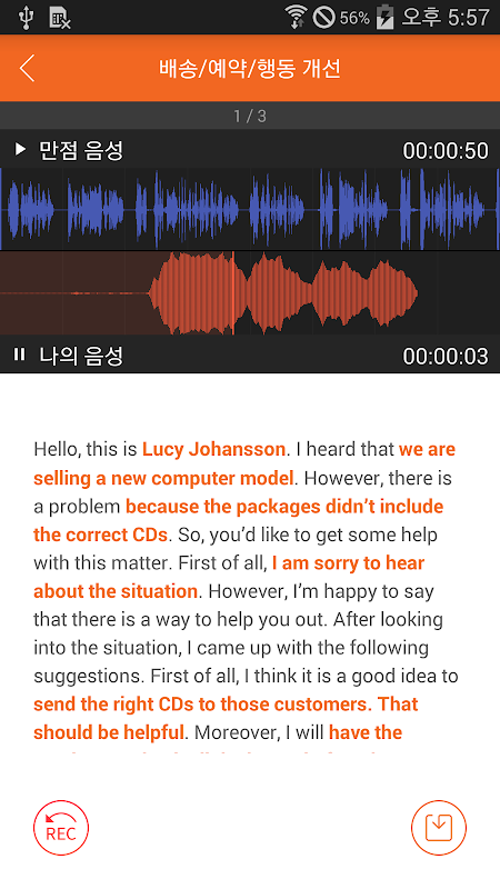 음성을 녹음하여 원어민의 음성과 자신의 발음, 강세, 억양을 비교해보세요