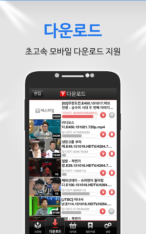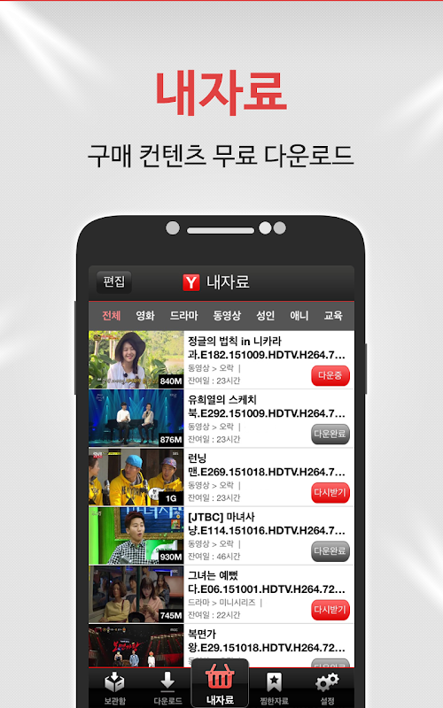 최신영화, 드라마, 애니, 동영상, 만화, 음악 등 다운로드 전용 무료앱 입니다.