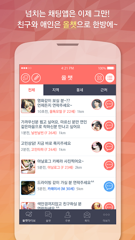 빠르고 간편하게 내 주변 사람들과 대화를 나누거나 셀프 소개팅, 데이트(만남) 약속을 잡을 수도 있으며, 마음에 드는 상대와 1:1로 채팅을 할 수 있습니다.