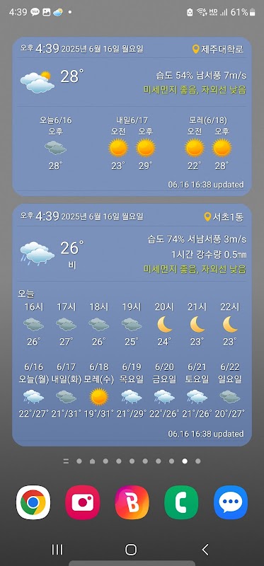 - บริการสภาพอากาศของเราให้บริการโดยใช้ข้อมูลสภาพอากาศจาก Korea Meteorological Administration และ Korea Environment Corporation และให้ข้อมูลที่ประมวลผลด้วยตนเองเพื่อความแม่นยำของสภาพอากาศเพื่อให้ผู้ใช้สามารถใช้ข้อมูลสภาพอากาศที่ดีที่สุดได้