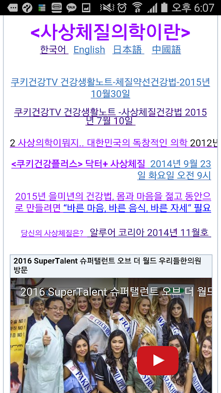 또한 한국의 명소, 가고싶은곳, 맛있는 음식, 약선음식, 맛집, 한국의 풍경, 민속놀이, 공연, 축제, 건강 동영상, 한의원 방문 유명인등에 대한 내용도 알려드립니다.