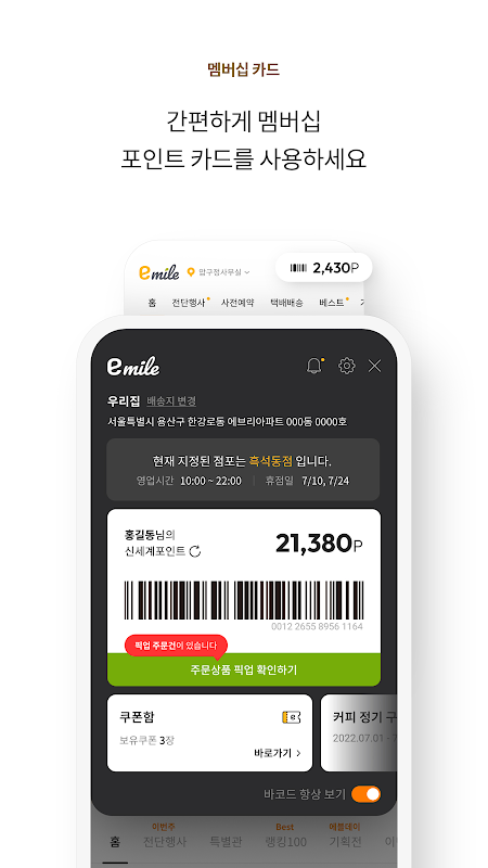 แอป E-Mart Everyday e-Mile ช่วยให้คุณเพลิดเพลินกับสิทธิประโยชน์และบริการที่หลากหลายได้อย่างสะดวกสบาย ไม่ว่าจะเป็นโปรโมชั่นสินค้า กิจกรรม ข้อมูลคูปอง การค้นหาร้านค้า และใบเสร็จรับเงิน ทั้งหมดนี้ทำได้จากสมาร์ทโฟนของคุณ