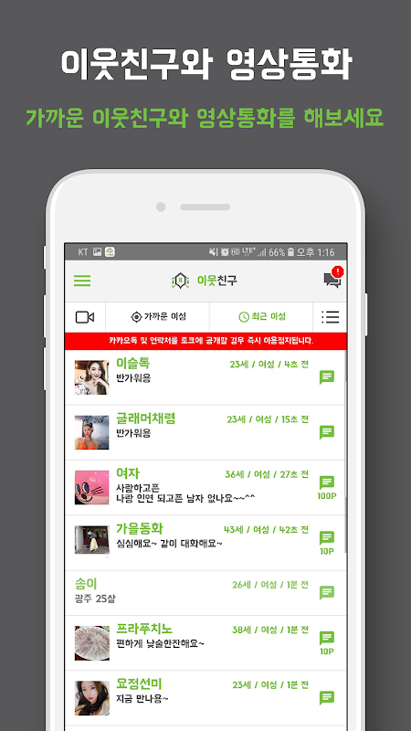 근거리 회원들을 보여주는 영상채팅도 지원해서 얼굴을 보면서 대화를 나눌 수도 있어요.
