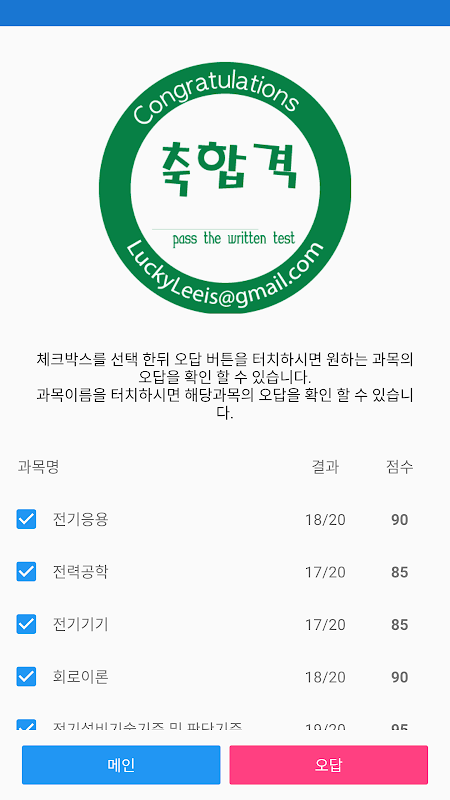성적확인 - 각 과목별 성적 및 그동안 풀어본 기출문제와 모의고사, 문제풀기의 성적을 볼 수 있습니다.