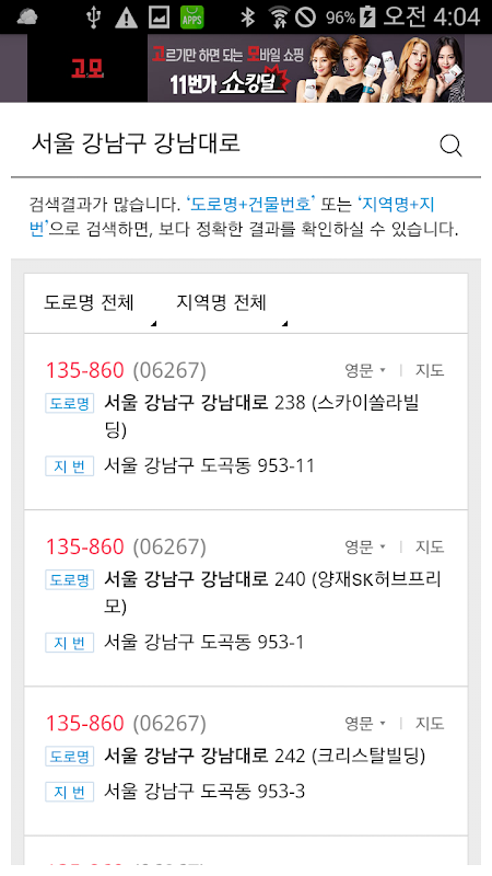 도로명, 지번, 영문주소는 물론 기존, 개편된 우편번호를 한 눈에 확인할 수 있습니다.