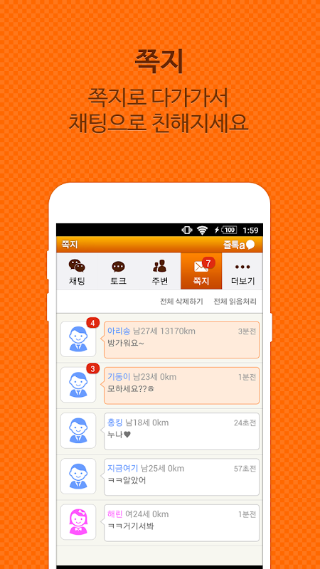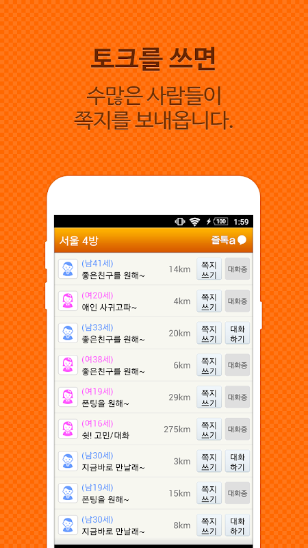 거리를 확인하고 성별을 확인하고 쪽지를 보내세요