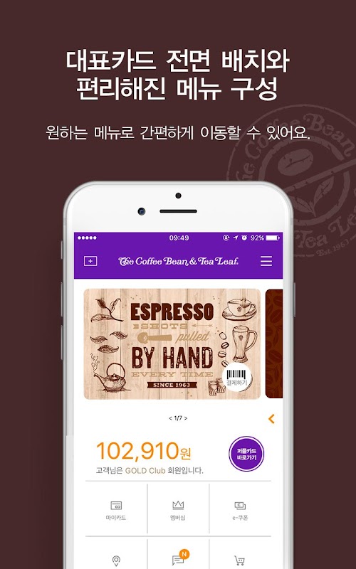 - 등록/구매: 커피빈 실물카드를 애플리케이션에 등록하거나 모바일 선불카드를 구매할 수 있습니다.