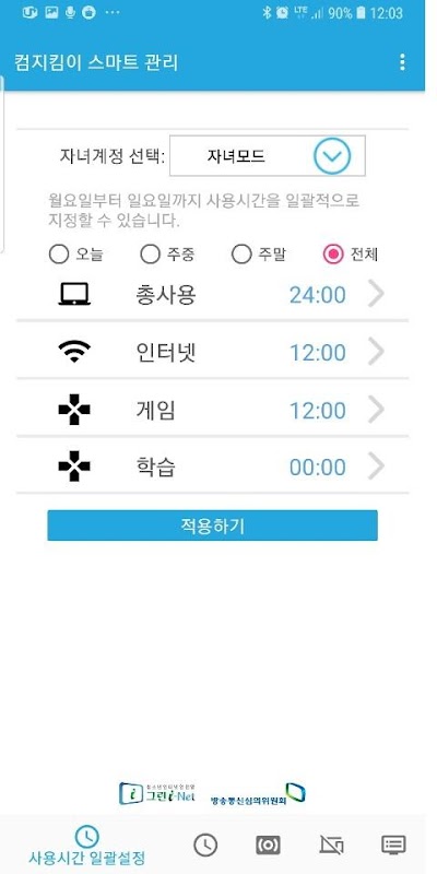 - 전체: 월~일요일 사용시간 설정