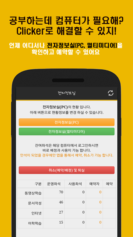 Clicker는 전자도서관 전체 시설관리를 위한 시스템 (Smart Library Management System) 으로서 Kiosk, PC, Tablet, Smart Phone등 모든 기기를 이용해 동일한 인터페이스로 열람좌석, 세미나룸, 멀티미디어룸, 사물함 등의 시설을 이용자와 연결해 주는 시스템 입니다.