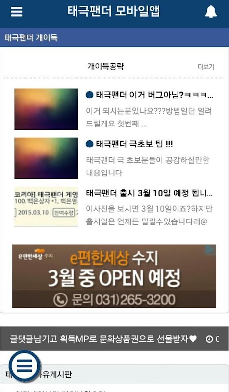 나와 같은 게임을 하는 유저들과 함께나누고 다양한 태극팬더 및 게임 공략 보고 활동포인트로 문화상품권구입까지!개이득♥ !! 다들접속하세요!!