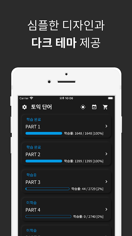 - เรารองรับธีมสีเข้มเพื่อให้คุณสามารถเรียนคำศัพท์ภาษาอังกฤษ TOEIC ได้อย่างสะดวกสบายแม้ในสภาพแวดล้อมที่มืด