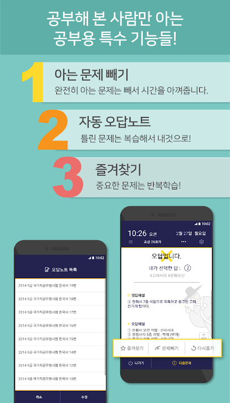 폰만 켜만 자동으로 한국사 기출문제를 볼 수 있습니다. 문제푸는게 번거롭다면 한번 쭉 읽고 부담없이 틀리세요. 명쾌한 해설을 보고 한번만 읽어보고 지나쳐도 큰 도움이 됩니다.