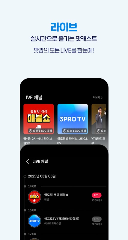 - ฟังเนื้อหาซ้ำจากสถานีออกอากาศ ตั้งแต่ผู้แพร่ภาพกระจายเสียงภาคพื้นดิน เช่น KBS และ SBS ไปจนถึงรายการที่ครอบคลุม เช่น TBS