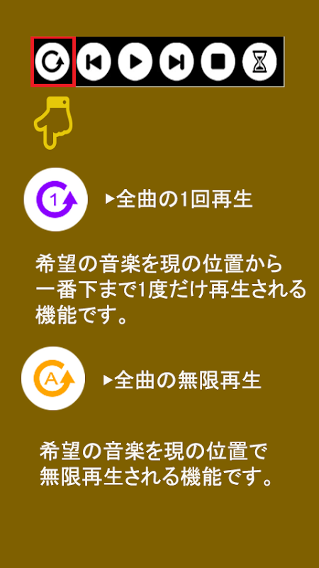 希望の音楽を現の位置から一番下まで1度だけ再生される機能です。